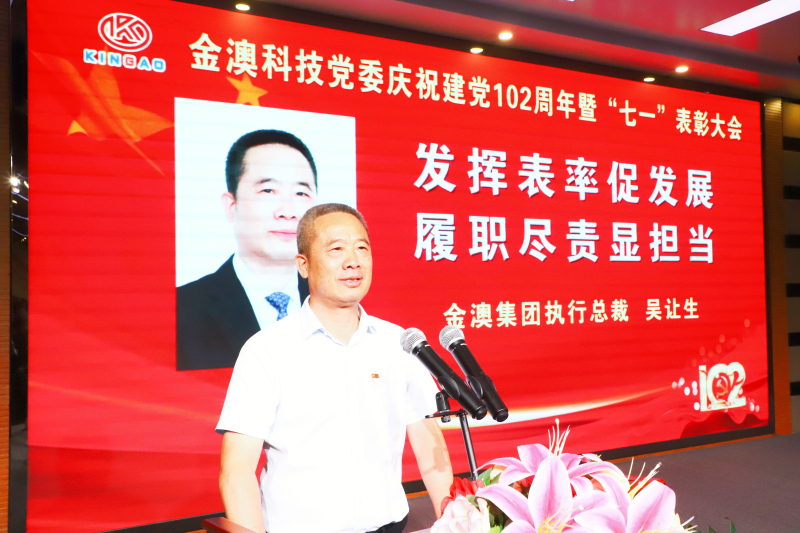 会上,吴总裁以《发挥表率促发展 履职尽责显担当》为主题发表讲话。他表示,公司党委每年都组织召开“七一”表彰大会,目的是进一步引导员工爱国、爱党、爱企、爱家,在工作中充分发挥共产党员的先锋模范带头作用,激发公司各党支部的组织活力,增强广大党员的光荣感、使命感、责任感,促进金澳的各项事业又好又快发展。