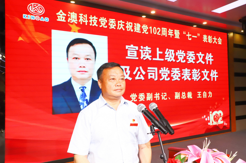【概要描述】​​​​​​​6月29日晚,金澳科技党委在多功能厅召开“党建引领聚合力 真抓实干促发展”——庆祝建党102周年暨“七一”表彰大会。全国优秀共产党员、金澳集团执行总裁吴让生出席会议,金澳科技党委书记、轮值总裁肖生强等党委领导班子成员及非当班党员、预备党员、入党积极分子、管理干部参加。