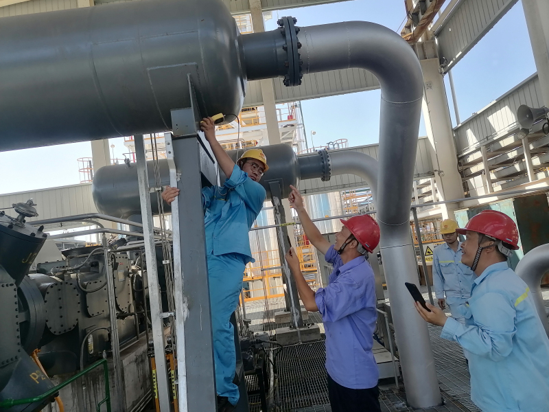 公司总裁助理郑经友,维修党支部委员、维修车间主任李辉组织车间值班人员,到加裂装置现场测量解析气压缩机组振动数据,确保设备安全运行。